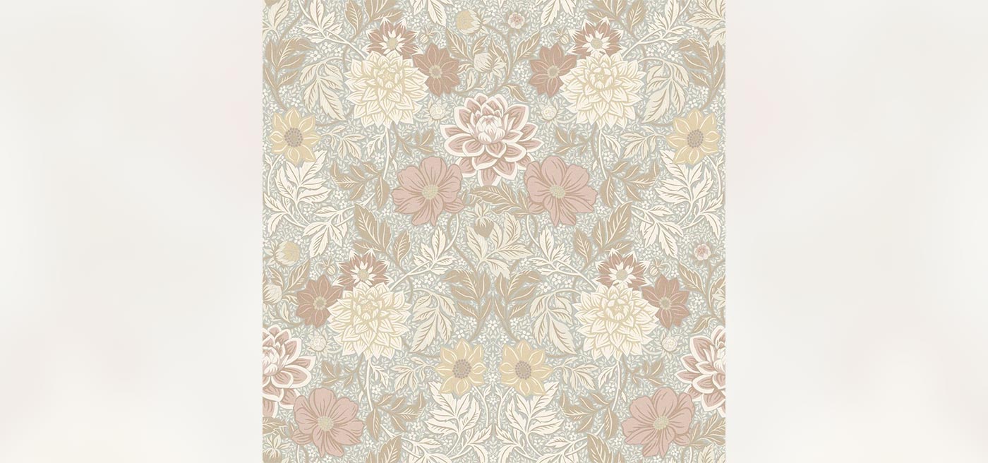 Here, Dahlia Garden Grand comes in soft, warm shades of pink, beige, yellow, and brown on a light blue-gray background. The wallpaper is custom fit to your wall.