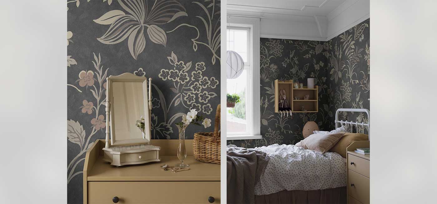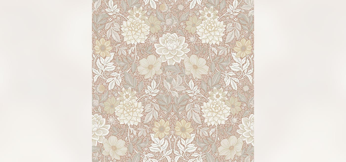 Dahlia Garden Grand is an enlarged digital reprint of our floral Dahlia Garden wallpaper. The luxuriant, hand-painted Arts & Crafts motif gets full room to shine on a truly large surface!