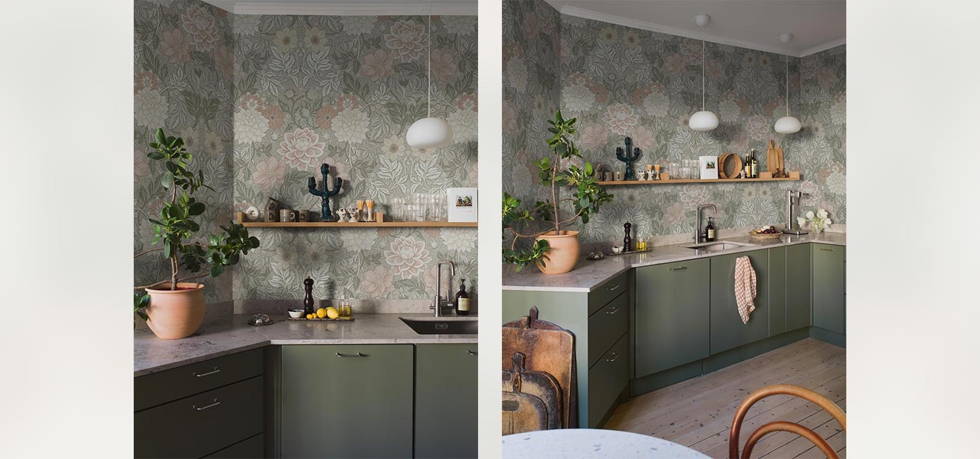 Dahlia Garden Grand is an enlarged digital reprint of our hand-painted Dahlia Garden pattern. At this scale, the intertwining dahlias and dense foliage take on a new expression – a calm yet vibrant wallpaper that truly makes a statement in any room.