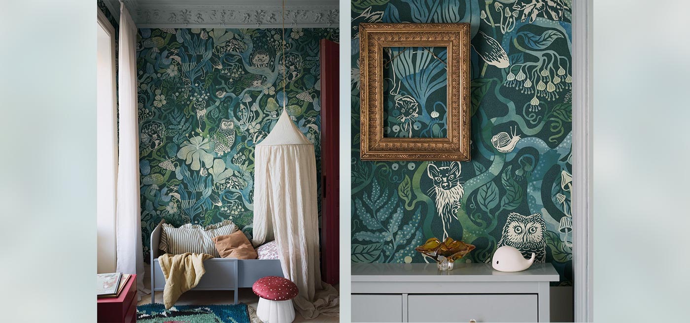 Magic Woods Grand is an enlarged digital reprint of the children’s wallpaper of the same name.