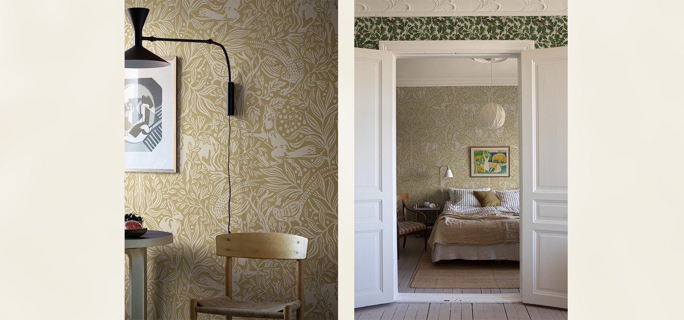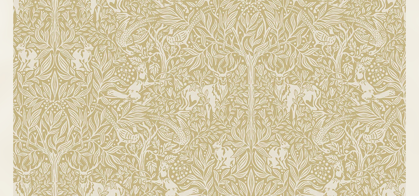 Under the Elder Tree Grand is adorned with the elder’s beautiful berries and leaves, with the occasional animal peeking through the branches. The pattern is inspired by medieval tapestries and also carries Arts & Crafts influences. In this enlarged scale, it becomes a powerful wall painting!