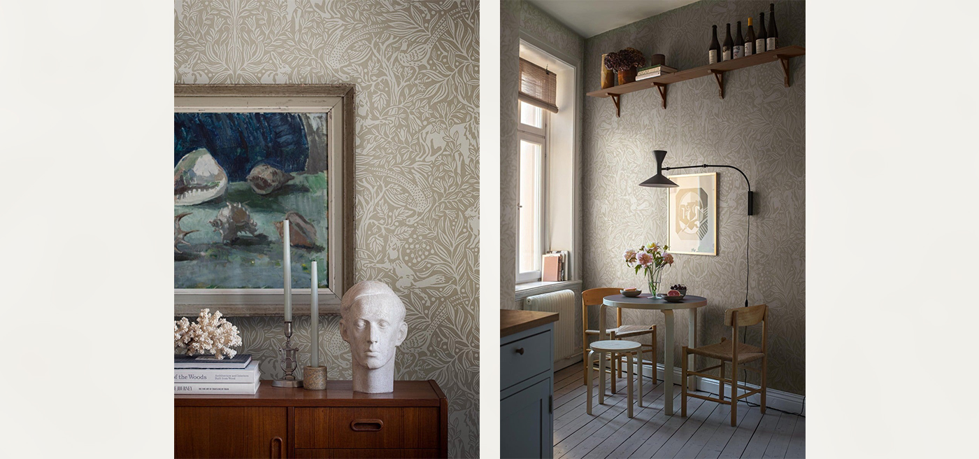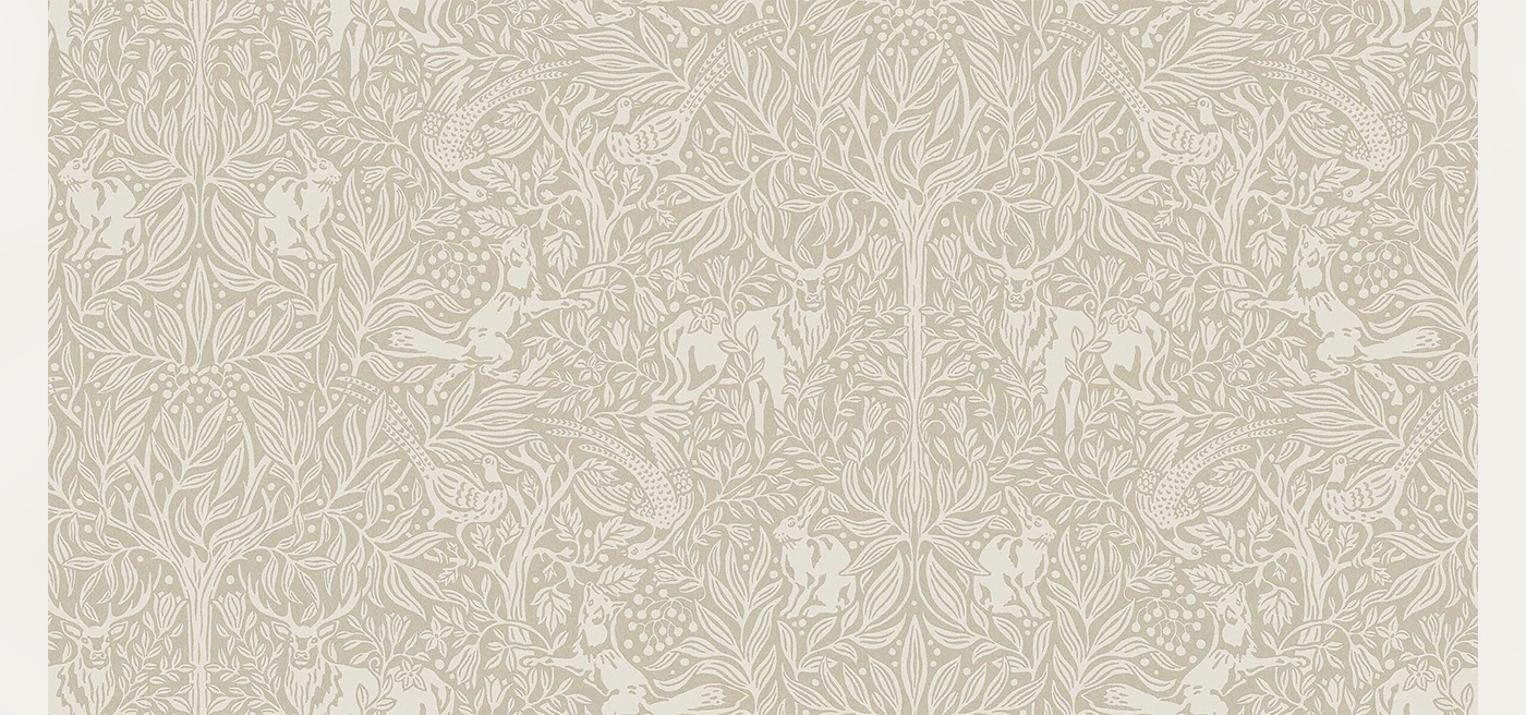 Under the Elder Tree Grand is an enlarged digital reprint of our block-printed wallpaper of the same name. The playful pattern, featuring proud stags and elegant pheasants among the elder leaves, is printed on a truly grand scale – like a large tapestry on the wall.