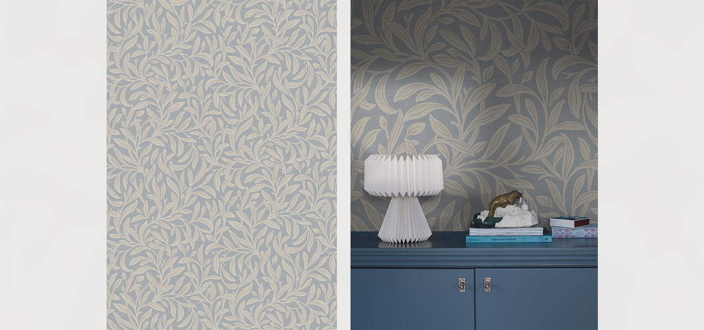 Over Vintergröna Grand’s pale sky-blue background winds a beige foliage with gray-brown leaf veins. This harmonious pattern is taken from the Vintergröna wallpaper – Vintergröna Grand is an enlarged digital reprint of this Arts & Crafts-inspired design.