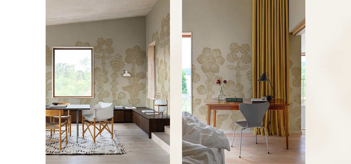 Storflax is a bright, playful mural wallpaper featuring a graphic pattern of pale yellow fantasy flowers stretching from the floor to the ceiling over a lightly textured, warm beige base.