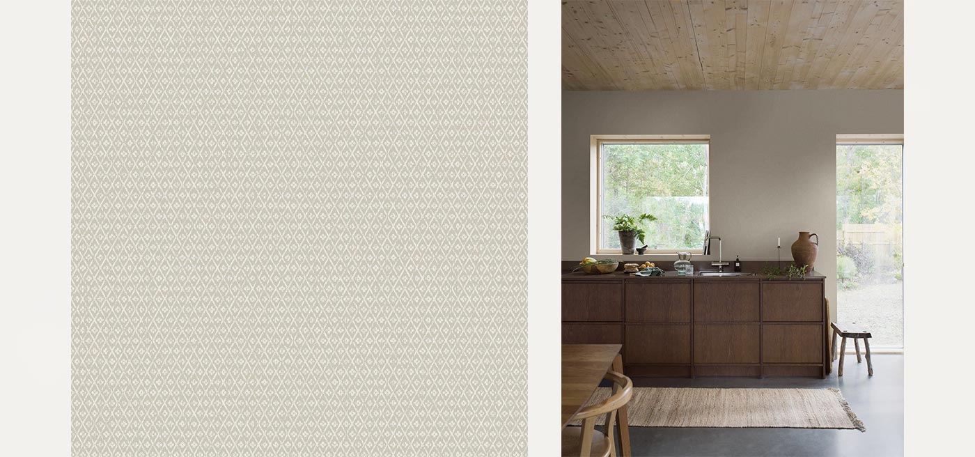 Coloured in contrasting and soft tones of light grey and beige, our Willowherb wallpaper is simple and rustic. Having the appearance of a single colour surface from a distance, its pretty petite design features a stylised four-petal flower within a diamond trellis pattern.