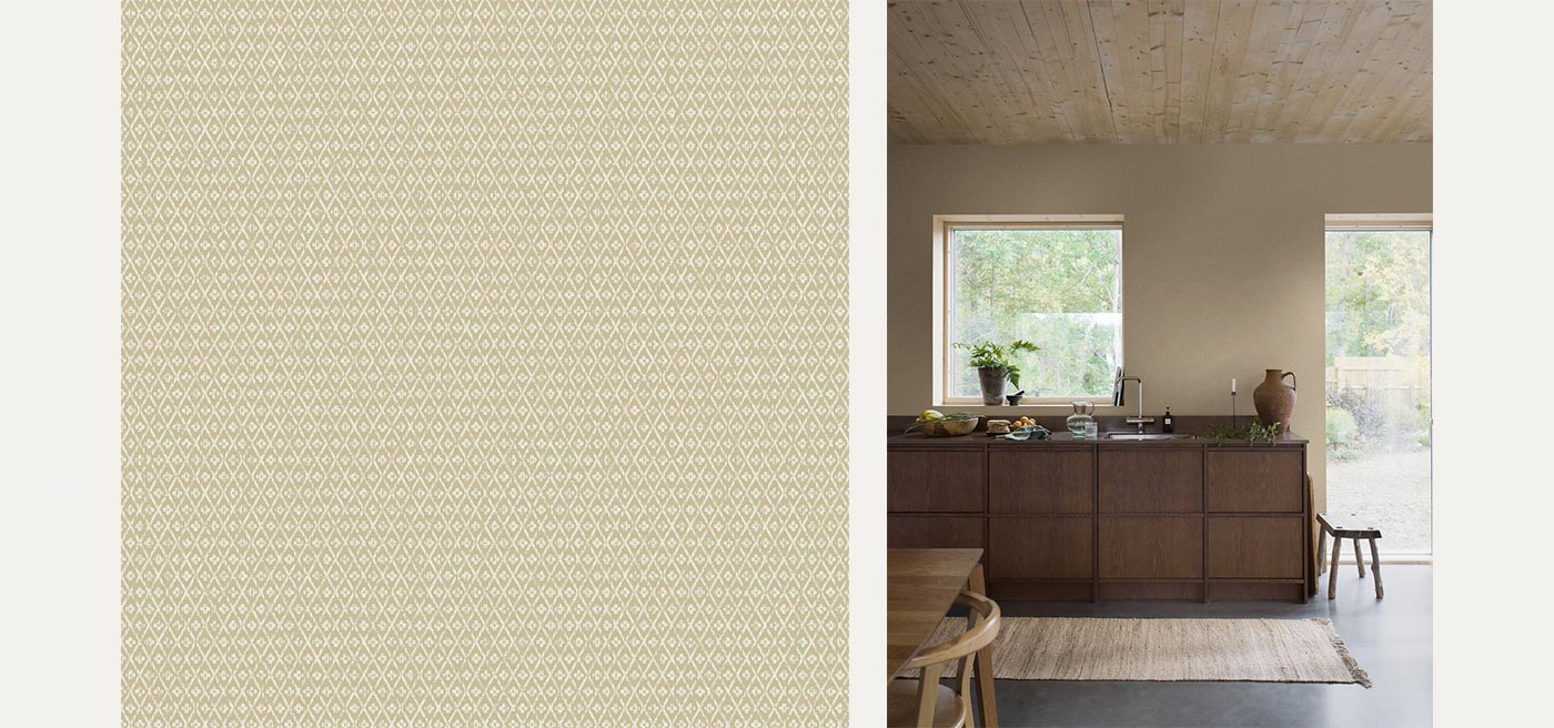 Coloured in soft hues of ochre yellow, our Willowherb wallpaper is warm and harmonious. The pattern is inspired by the flowers of the Rose Bay Willow Herb and features a small diamond trellis arrangement filled with simple yet elegant four petal flowers.