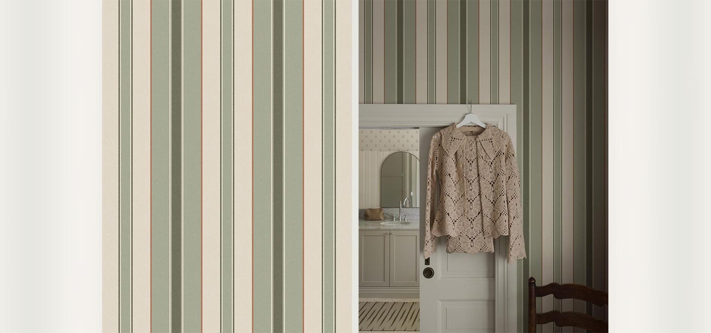Stockholm Stripe is digitally printed in several colourways; here, the wallpaper features different shades of antique green and creamy white, accented by a narrow terracotta stripe.