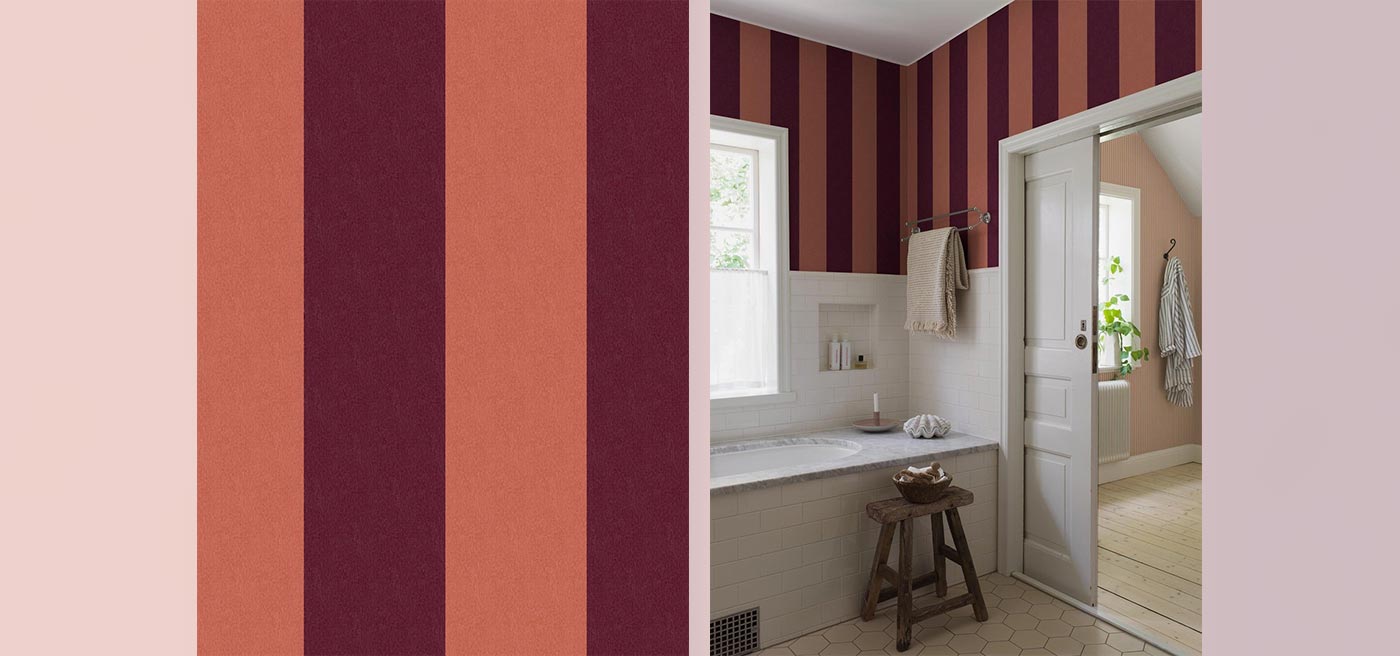 Bjärö Stripe is a wide-striped wallpaper full of character. Bold, extra-wide block stripes presented here in a rich and elegant colourway, where muted brick red meets deep bordeaux.