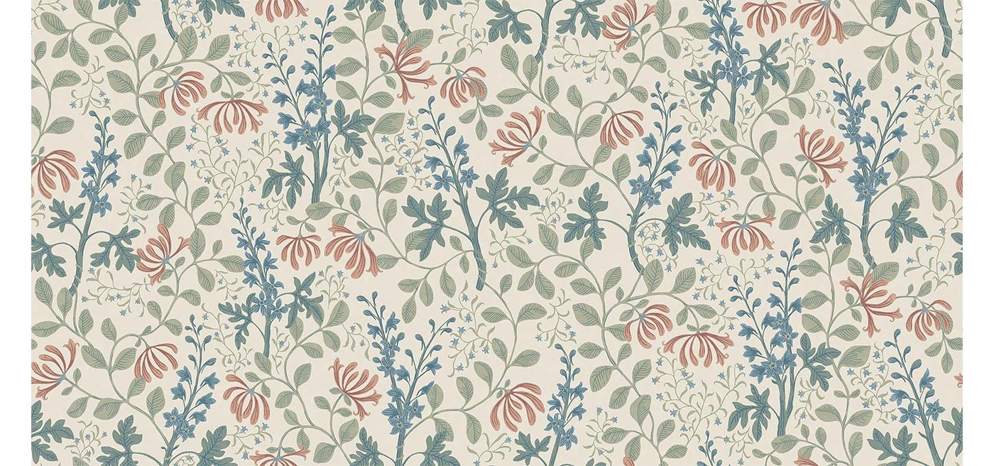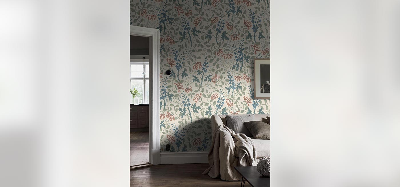 Trädgårdsfröjd Grand är ett förstorat nytryck av Nora Tysklinds blommiga tapet Trädgårdsfröjd. Det slingrande mönstret av kaprifol och riddarsporre är målat med inspiration från Dalarna, och här går tapeten i toner influerade av våra klassiska allmogefärger: dämpade nyanser av rött, blått och lindblomsgrönt på beige botten.