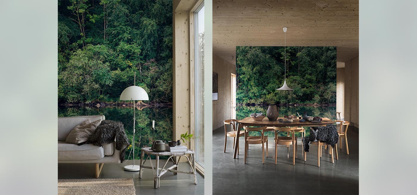 The deciduous trees stand gathered along the shoreline, dressed in the deep greenery of midsummer, their crowns quietly reflecting in the still water. This photo mural captures more than a place – it captures a sense of stillness and presence. Thanks to the varied textures of the foliage, the image gains depth and an almost graphic quality that works beautifully in both bedroom and living room.